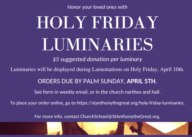 This year we will have luminaries displayed on Holy Friday honoring our loved ones, living and departed. If you would like to honor someone, please fill out the form below. All proceeds will go toward the Youth Program and Church School.